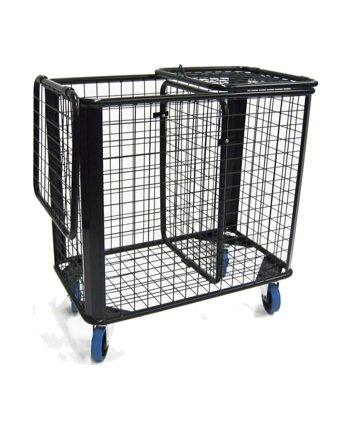Bollvagn i lackerat stål. Två lock som fälls ner längs sidorna. Reglerbar avdelare på insidan för att dela upp på olika bollar/material. Rymmer ca 18-20 basketbollar. Stora hjul som skonar golv och golvlister samt låsbart lock.